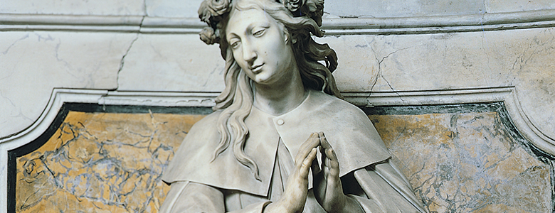 È la patrona di Palermo dal 1666, ma ciononostante vi è anche a Napoli una statua realizzata in suo onore. Santa Rosalia, figlia di Ruggero Sinibaldi nata nel XII secolo, apparteneva alla famiglia dei conti dei Marsi e di Sangro. Fu per questo che il principe di Sansevero decise di far costruire all’interno della propria Cappella Sansevero un’opera che rendesse omaggio alla sua antenata più illustre. Nella terza cappelletta a sinistra, che separa la “Soavità del giogo coniugale” dalla “Pudicizia”, è situata la statua di Santa Rosalia. Elogiata anche da Antonio Canova per la morbidezza dei lineamenti, fu realizzata da Francesco Queirolo nel 1756. La donna, con la testa leggermente inclinata verso destra, è rappresentata nell’atto di pregare mentre è inginocchiata su un cuscino. Il capo è cinto da una corona di rose in onore del suo nome e a completare il monumento funebre vi sono una lapide commemorativa, in marmo rosso, e due angioletti.