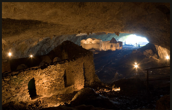 Proprio all’altezza dell’ultimo martyrium si notano due strane figure affiorare dalla terra. Si tratta di alcuni raccoglitori d’acqua realizzati dai monaci lavorando due grandi stalagmiti che, svuotati per un diametro di circa cinquanta centimetri, fanno giungere l’acqua in una vasca di decantazione. Qui, ripulita quanto più possibile, essa giunge, attraverso una rete di canali coperti, a tre punti della grotta. Si tratta della stessa acqua che gocciola dalla volta della caverna e che alimenta la fontana situata all’ingresso della grotta ove si dissetano gli stanchi ma soddisfatti pellegrini.