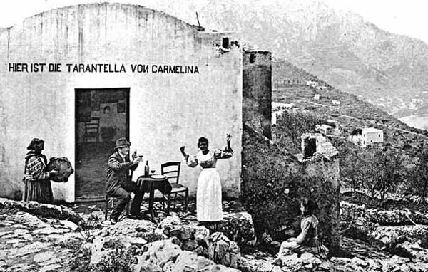 Qui era possibile gustare l’ottimo vino rosso caprese od una gustosa macedonia di pesche immerse nel vino bianco. Carmelina, però, non era completamente appagata da questa sua vita da ristoratrice e decise di dar libero sfogo alla sua personalità deliziando i suoi clienti col ballo della tarantella.