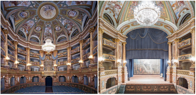 Il teatro è situato nella parte occidentale del palazzo, ed ha quattro ingressi: uno riservato al re ed alla corte, due laterali con scale a chiocciola per il pubblico ed un altro per gli artisti ed i macchinari tecnici, situato alle spalle del palcoscenico collegato direttamente con l’esterno. Il teatro di corte ha la forma a ferro di cavallo, occupa i primi due livelli del palazzo e dispone di 41 palchi disposto su cinque file ed un palco reale. I palchetti sono stati decorati da Gaetano Magri con puttini, corone di foglie, fiori e conchiglie.