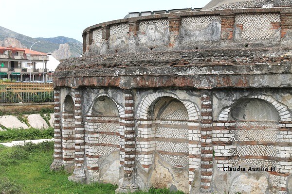 La facciata del tamburo esterno è scandita per oltre la metà da nicchie alternate a fondo piano e curvo con copertura a calotta rivestita in origine da stucco modellato a valva di conchiglia. Le nicchie sono separate da semi colonne tuscaniche rivestite anch’esse di stucco scanalato. Il corpo centrale è collegato a quello esterno tramite setti radiali che lasciano grossi spicchi vuoti tra le due strutture i quali forse erano ricolmi di terra con alberi, ad imitazione del mausoleo di Augusto a Roma.