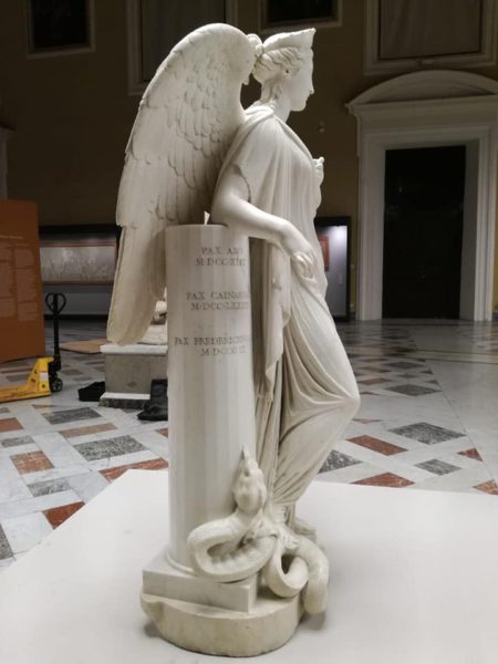 La statua fu realizzata da Canova tra il 1811 e il 1815, rappresentante delle contorte vicende politiche che hanno travolto l’Europa in quegli anni. La sua lunga storia è stata ignorata fino al ritrovamento, avvenuto circa quindici anni fa da Irina Artemieva, conservatrice dell’Arte veneta e funzionario del Museo Statale Ermitage. Fu trovata, infatti, una lettera dello stesso Antonio Canova all’ambasciatore russo a Vienna. Lo scritto ha permesso di ricostruire l’origine della stupenda scultura e la sua storia. La commissione della “Pace” è legata al principe Nicolaj Rumianzev, protagonista del panorama politico europeo e russo dell’800, mezionato, altresì, da Lev Tolstoj in “Guerra e Pace”.