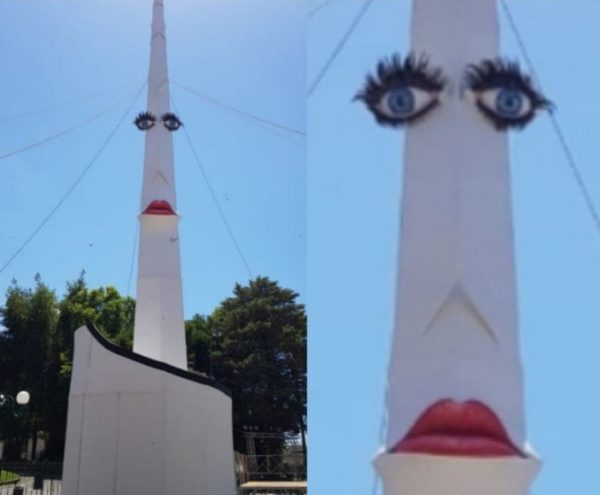 Una struttura piramidale di un candido colore bianco, puro, etereo, vergine, in cui prendono forma con una pragmatica e terrena forza, due labbra turgide e carnose dipinte di rosso e due occhi, grandi e profondi di un colore azzurro celestiale, ravvivate da ciglia lunghe e nere, il tutto completato da un nasino all’insù che senza dubbi, completa un volto di una donna. E poi nascosto tra le aste di legno, si aggroviglia un lungo velo bianco, che nella giornata di domenica 30 giugno verrà sciolto e con i suoi 35 metri di lunghezza coprirà “la testa e la schiena” della bella sposa.