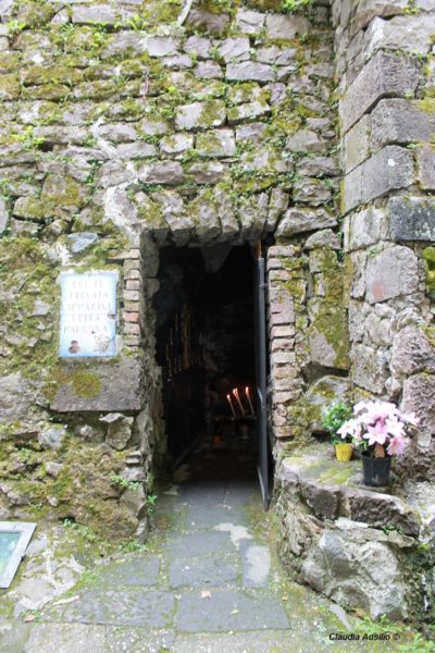 Sul lato sinistro della chiesa c’è una piccola porta che conduce ad un angolo suggestivo incorniciato da rosari, ex voto e ricordi di fedeli. Si tratta proprio della grotta del ritrovamento dell’icona mariana. Quando è stata ritrovata la statua era di colore grigio chiaro, poi è stata colorata. Maria indossa un abito rosso col mantello azzurro, vestiario tipico del Trecento.