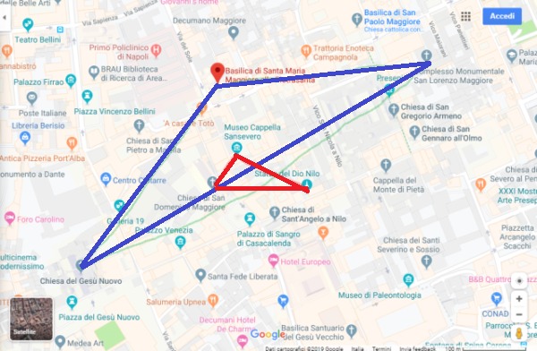 Quest’ultimi, infatti, sarebbero giunti a Napoli intorno al I secolo a. C. per motivi commerciali, costituendo quella che oggi è, non a caso, denominata Piazzetta Nilo. Ed è proprio qui che si troverebbero i due misteriosi triangoli magici. Il primo (tracciato col colore rosso sulla mappa) avrebbe come vertici la chiesa di San Domenico Maggiore, la statua del dio Nilo e Cappella Sansevero; l’altro (tracciato col colore verde) unirebbe la chiesa del Gesù Nuovo, la chiesa di San Lorenzo Maggiore e la chiesa di Santa Maria Maggiore. Tra l’altro, come si può ben vedere, le due figure geometriche si intersecano, con il secondo a contenere buona parte del primo.