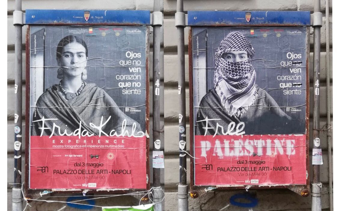 Lasciato l’ambito del fotogiornalismo (al momento è fotografo di scena della serie L’Amica Geniale), Edoardo si è dedicato, tra le altre cose, agli interventi di street art, interventi dai messaggi forti, chiari, di grande sensibilità ed una creatività dirompente: ecco che i manifesti per la mostra di Frida Kahlo diventano messaggi di speranza e supporto, trasformando il nome dell’artista in FREE PALESTINE, con tanto di video che ci mostrano il veloce processo.