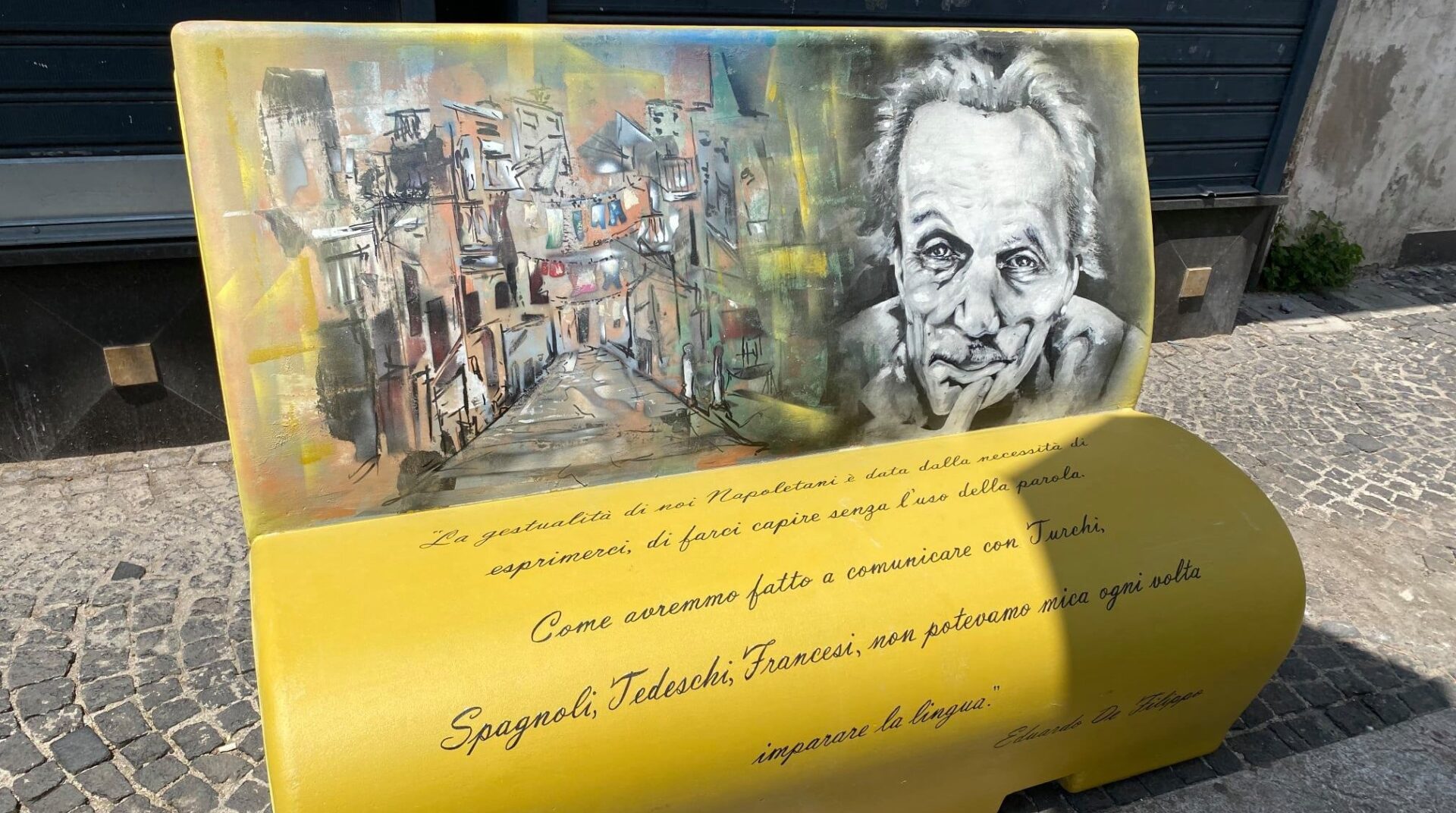 “La gestualità di noi napoletani è data dalla necessità di esprimerci, di farci capire senza l’uso della parola. Come avremmo fatto a comunicare con turchi, spagnoli, tedeschi e francesi, non potevamo mica ogni volta imparare la lingua” – è la frase di Eduardo che spiega esattamente l’essenza di ogni napoletano e che è scritta sulla panchina a lui dedicata.