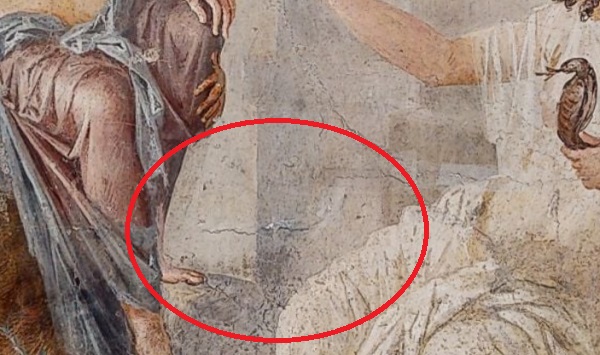 Come denuncia l’archeologa e giornalista Valentina Porcheddu ci sono profonde fessure e non solo. Nella parte inferiore del dipinto c’è una “velinatura”, come si chiama in termini tecnici, cioè un intervento di restauro fatto quando lo strato di colore che non aderisce più al supporto, subisce forti sollevamenti. La giornalista dice che durante la mostra andata in scena dal 30 settembre 2022 all’8 gennaio 2023 in Belgio, il “rattoppo” con carta giapponese c’era già. “Quando è stato effettuato l’intervento di “pronto restauro”? Il reperto si è danneggiato durante il viaggio da Napoli al Belgio? In questo caso, perché si è deciso non solo di esporlo per cinque mesi in quel paese, ma addirittura di inviarlo in Francia per altri 4 mesi?“, ha detto Valentina Porcheddu.