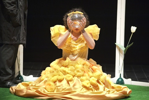 Ce lo racconta Davide Sacco, autore e regista, attraverso la storia di una squallida periferia in cui vivono tre fratelli, i quali si rinchiudono nelle loro ampolle cristalline per sfuggire un’esistenza troppo crudele e impietosa che li soffoca e inesorabilmente li inaridisce. Tra le crepe di questa vitrea prigione, i tre attori ci fanno entrare nel mondo in cui essi si sono rifugiati: la piccola Mimì (Eva Sabelli), “troppo pura e vera per questo mondo”, è una bambina di trent’anni che fugge da quella realtà tetra e crudele, per alleviare la sofferenza in luoghi della mente dove tutto è bello, dove tutto è un gioco; tuttavia è grazie ai giochi che la piccola Mimì fa con Fefè, il pesce rosso che dorme da sei mesi -in realtà morto- che ci mostra la squallida vita vissuta con la madre malata, morta anch’ella, e il fratello ricchione, Mimma.