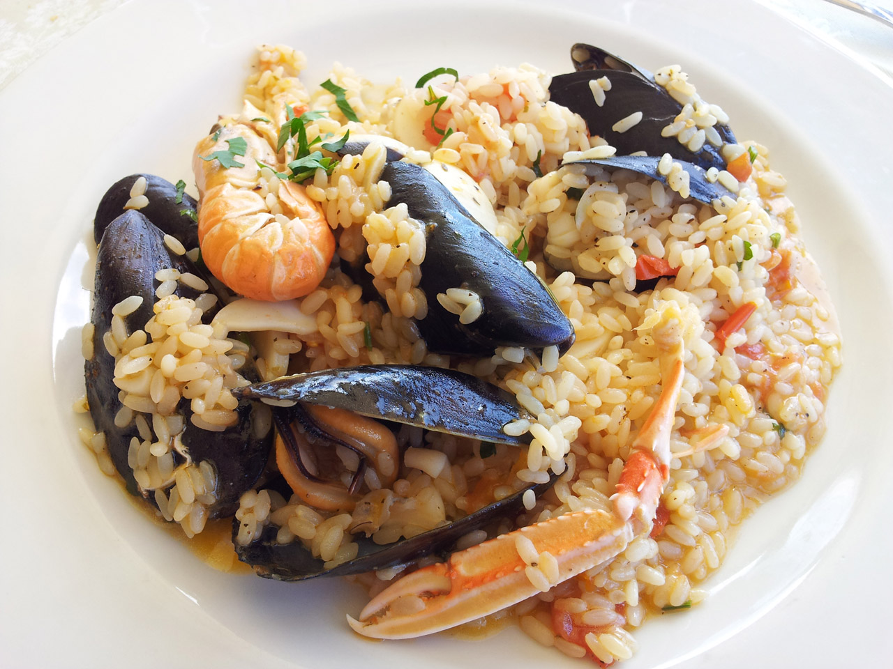 Mettete le cozze e le vongole in una pentola con acqua in modo tale che si schiudano, mescolando di tanto in tanto. Sgusciarle, lasciandone qualcuna per la decorazione finale. Filtrare il liquido sul fondo della pentola. Intanto fate cuocere con un filo d’olio e per pochi minuti i gamberetti. Scaldate il brodo e nel frattempo tritate il prezzemolo. Unite al brodo i calamari, il vino bianco, il riso, mescolando accuratamente e costantemente. Regolate di sale ed unite i gamberetti, le cozze e le vongole, il prezzemolo poco prima della cottura completa. Decorate con qualche cozza lasciata da parte ed un po’ di pepe.