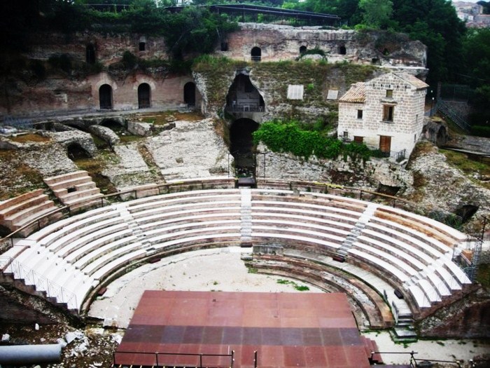 Teano conserva uno dei più grandi teatri del mondo romano, recentemente restaurato e reso nuovamente fruibile ai visitatori. Costruito nel II secolo a.C., nel pieno dell’età repubblicana, ha attraversato tutte le fasi dello stile architettonico imperiale. La decorazione del teatro fu rinnovata durante il regno di Augusto, probabilmente dopo l’elezione di Teanum Sidicinum a colonia romana, a questa fase risale anche un ciclo di statue e un ritratto in marmo greco, conservate nella definitiva sistemazione dell’edificio. Esso fu completamente restaurato agli inizi del III secolo d.C., grazie all’imperatore Settimio Severo e terminato dall’imperatore Gordiano.