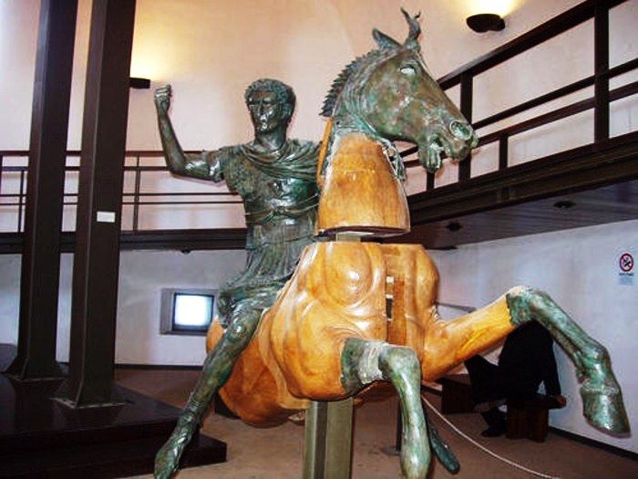 La statua equestre era un monumento onorario eretto nel 91 d.C. per celebrare le vittorie conseguite dall’imperatore Domiziano contro i Germani. La scultura di bronzo, con intarsi d’argento e di rame, raffigura Domiziano in sella ad un cavallo, in posizione rampante, che tiene in modo vigoroso le redini verso sinistra. Il cavaliere indossa una corazza con decorazioni a rilievo e il braccio destro è sollevato ad impugnare l’asta.