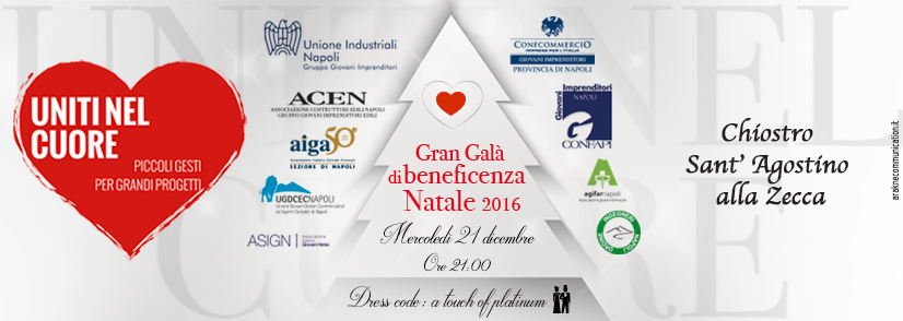 Anche quest’anno torna l’evento Uniti Nel Cuore. Solidarietà, questo il comun denominatore che ormai da diversi anni unisce le Associazioni Datoriali e Professionali del tessuto produttivo di Napoli e provincia, per il consueto Gran Gala di Natale, anno 2016. Quest’anno gli organizzatori hanno deciso di farsi in 4 e il ricavato sarà devoluto a 4 Onlus. Location dell’evento la suggestiva cornice dello splendido Chiostro di Sant’Agostino alla Zecca, C.so Umberto I n. 174. La scelta è caduta su questa particolare location perché ispirata dalla volontà delle Associazioni organizzatrici di valorizzare maggiormente uno degli angoli più belli e nascosti di Napoli.