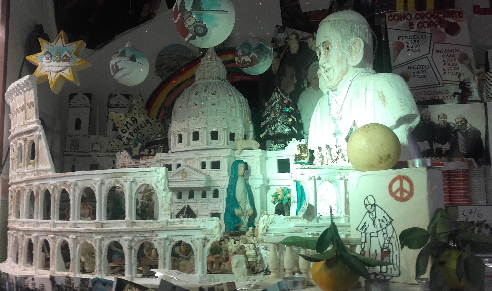 Il presepe è stato posizionato all’ingresso della nota Gelateria Primavera di Corso Italia a Sorrento. La particolarità del presepe è che, oltre ai classici San Giuseppe, la Madonna e il bambinello, è presente anche lo stesso cantautore con il suo immancabile pianoforte ed alcuni scorci della capitale suggeriti dallo stesso brano.