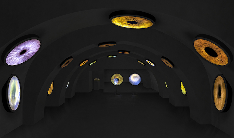 Una grande cupola nera invita ad entrare, il buio accoglie i visitatori per qualche istante, poi inizia il viaggio: quindici light box raffiguranti iridi di persone cieche o ipovedenti pulsano nell’oscurità e si raccontano. Sono le voci di donne, uomini e ragazzi che hanno perso la vista, testimonianze di vita vera, frammenti di storie che rivelano al visitatore le difficoltà quotidiane di una vita al buio. Rabbia, paura, malinconia, ma anche una straordinaria voglia di vivere.