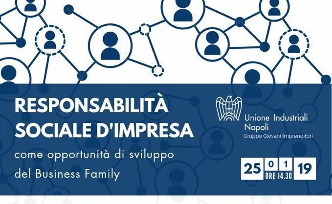 L’evento Responsabilità Sociale d’Impresa si terrà venerdì 25 Gennaio, alle 14,30, presso la sede dell’Unione Industriali di Napoli, ed è promosso ed organizzato dal Gruppo Di Lavoro “Business Family” coordinato dal Vice Presidente GI, Salvatore Formisano, in collaborazione con il GPI. Esso ha lo scopo di sensibilizzare le imprese alla responsabilità sociale nell’ambito del Business Family. Vedrà la presenza di notevoli esponenti del settore tra cui: