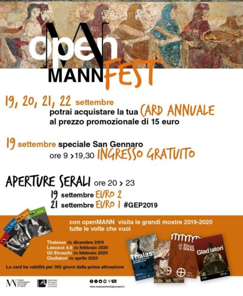 «E’ con grande entusiasmo – dichiara il Direttore del MANN, Paolo Giulierini – che invitiamo cittadini e turisti alla nostra OpenMann Fest d’autunno. La inauguriamo in una giornata cara a tutti napoletani, il 19 settembre, San Gennaro, santo patrono della città, che festeggeremo con l’ingresso gratuito dalle 9 alle 19 e tante sorprese. Per quattro giorni, fino a domenica 22 settembre, sarà possibile acquistare abbonamenti annuali a prezzo promozionale, ci saranno due aperture serali e tante attività. Una stagione entusiasmante ci attende, la inizieremo immergendoci nella archeologia marina con Thalassa, passeggeremo nelle grotte preistoriche di Lascaux, riscopriremo gli Etruschi, ed è già partito il conto alla rovescia per la grande mostra Gladiatori. Ma non solo. Siamo al lavoro per una programmazione interculturale e attenta ai temi dell’attualità a partire dall’ambiente. Dal 10 ottobre allestiremo una mostra sul cambiamento climatico con National Geographic. Vi aspettiamo tutti nel vostro Museo, da vivere ogni giorno, con orgoglio e spirito di comunità».