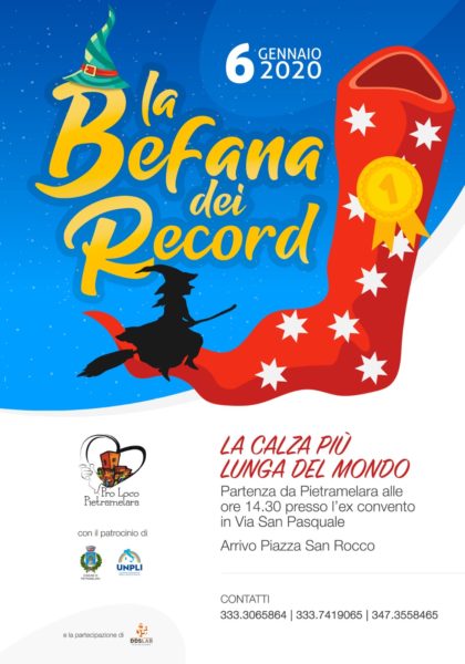 A Pietramelara, un piccolo comune di circa 5mila abitanti situato in provincia di Caserta, si sta preparando una befana molto speciale. L’obiettivo che si è posto la Pro Loco di questo Comune si rivela abbastanza ambizioso e in grado di captare l’interesse diffuso di un nutrito gruppo di turisti: realizzare una “calza della befana” da record, lunga 80 metri (20 metri in più della calza con cui Viterbo ha ottenuto il record mondiale).