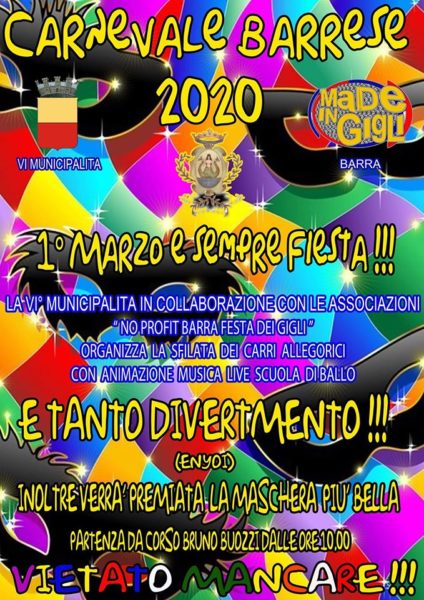 Il Carnevale Barrese si terrà il 1° marzo 2020 e sarà organizzato dalla VI Municipalità in collaborazione con le associazioni ‘No profit Barra Festa dei Gigli’. Saranno organizzati dei carri allegorici che sfileranno per le strade del quartiere. La partenza dei carri è prevista per le ore 10.00 dal Corso Bruno Buozzi, corso principale del quartiere. Inoltre, ci saranno animazione, musica e l’esibizione live di una scuola di ballo. Verrà anche premiata la maschera più bella della giornata.