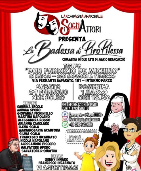 Da ragazzi le passioni sono tante, ma portarle avanti anche quando si cresce non sempre è semplice. C’è riuscita la Compagnia ‘I Sognattori’ di Barra che continua a regalare serate agli appassionati di teatro con spettacoli teatrali di ogni genere. Questa volta sarà il turno de ‘La Badessa di Piropilessa’, commedia in due atti di Mario Brancaccio.