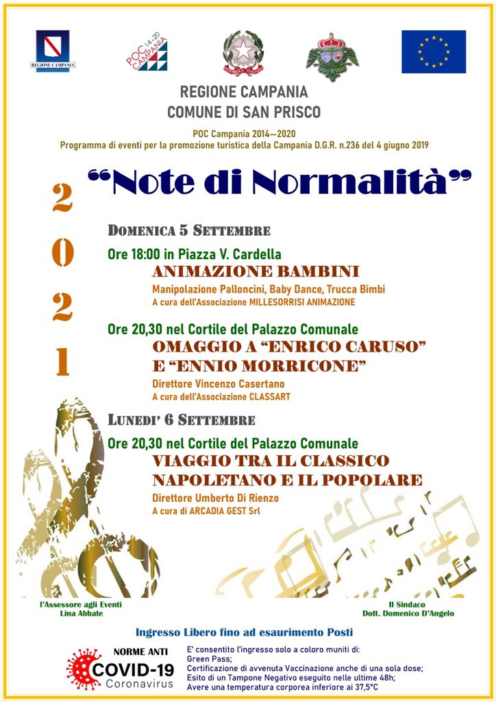 Il giorno successivo, lunedì 6 settembre, ci sarà alle ore 20:30 sempre nel cortile del Palazzo Comunale, lo spettacolo musicale “Viaggio tra il classico Napoletano e il Popolare”, a cura di Arcadia Gest, diretto da Umberto Di Rienzo. Nel rispetto delle normative tese a regolamentari gli afflussi a causa del Covid-19, l’acceso sarà consentito fino all’esaurimento dei posti nel rispetto del distanziamento sociale e sarà limitato solo ai possessori del Green Pass. Infine ci saranno dei controlli tesi a permettere l’accesso solo a che avrà una temperatura corporea inferiore ai 37,5 gradi