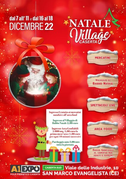 Prende il via la prima edizione di Natale Village, uno degli eventi dedicati al periodo più magico dell’anno, che si terrà presso il Polo Fieristico A1Expò di Caserta Sud (viale delle Industrie, 10), dal 7 all’11 e dal 16 al 18 dicembre 2022.