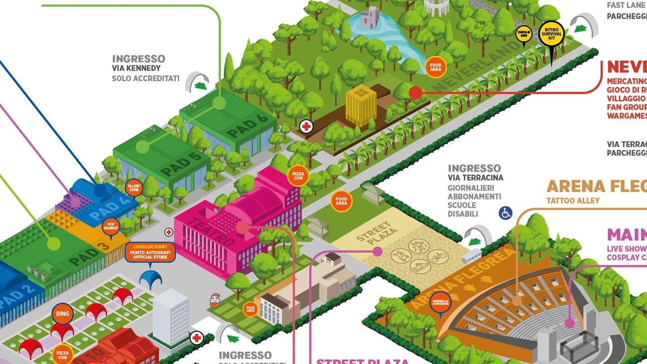 La piantina riproduce il grande villaggio dei cosplayer, dedicato agli amanti di fumetti, giochi, cinema, serie tv e musica, che per l’edizione partenopea del 2023 si arricchisce di tre nuove aree: Street Plaza dedicata alla cultura urban e al mondo dello streetwear dotata di uno skate park e di uno spazio street dance; sala incontri WOW, un’area kids estesa con mostre, laboratori e una sala dedicata agli incontri; Arena Flegrea che torna a distanza di 4 anni con la Tattoo Alley, la nuova area dedicata ai tatuatori.
