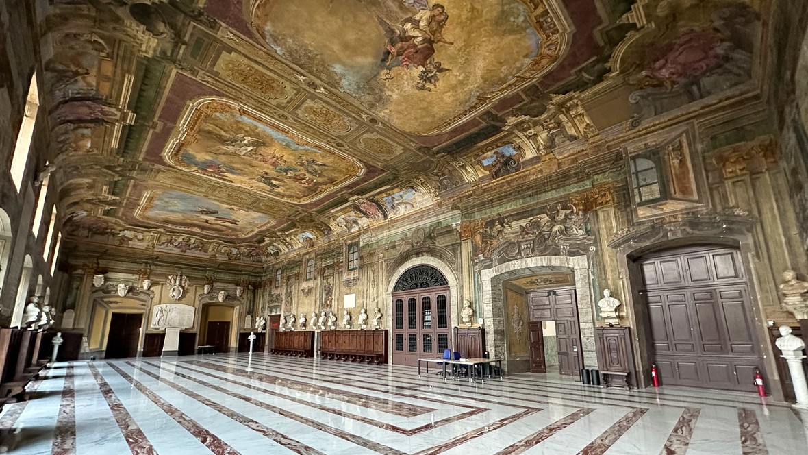 marzo 1882, i ritratti dei giuristi che resero illustre il Foro di Napoli. Di notevole interesse il programma decorativo delle pareti, che celebra il tema della Giustizia ed è caratterizzato da un ritratto equestre di Carlo III di Borbone. Il giro si concluderà nella Sala della Ruota de’ Conti o della Gran Ruota dove si potrà ammirare uno spettacolare soffitto ligneo a cassettoni, intagliato e dorato, con al centro lo stemma degli Asburgo di Spagna.