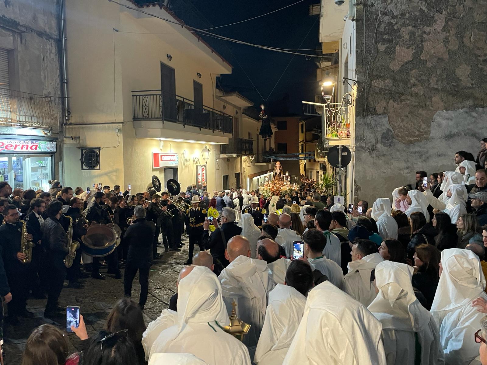 Ben 2000 confratelli con il saio bianco, 4 congreghe, 4 gruppi cantorum che intonano il Miserere tutto in latino e lungo tutta la durata della processione. Più di 8000 donne, migliaia di candele nei vicoli accese grazie a dei falò preparati dalla popolazione già dalle prime ore del pomeriggio e accesi poco prima dell’uscita della processione, alle ore 19 dalla chiesa più antica, quella della Collegiata, nel cuore del Borgo Antico. Il canto del Miserere in latino lo si ascolta anche a distanza dai balconi, dalle terrazze, in tutto il paese, mentre la banda intona le marce funebri tra cui la Sonata n. 2 di Chopin. Un vero fiume di fiammelle lungo almeno 3 km accompagna l’intera atmosfera. Si tratta di una delle più antiche processioni di tutto il sud Italia.