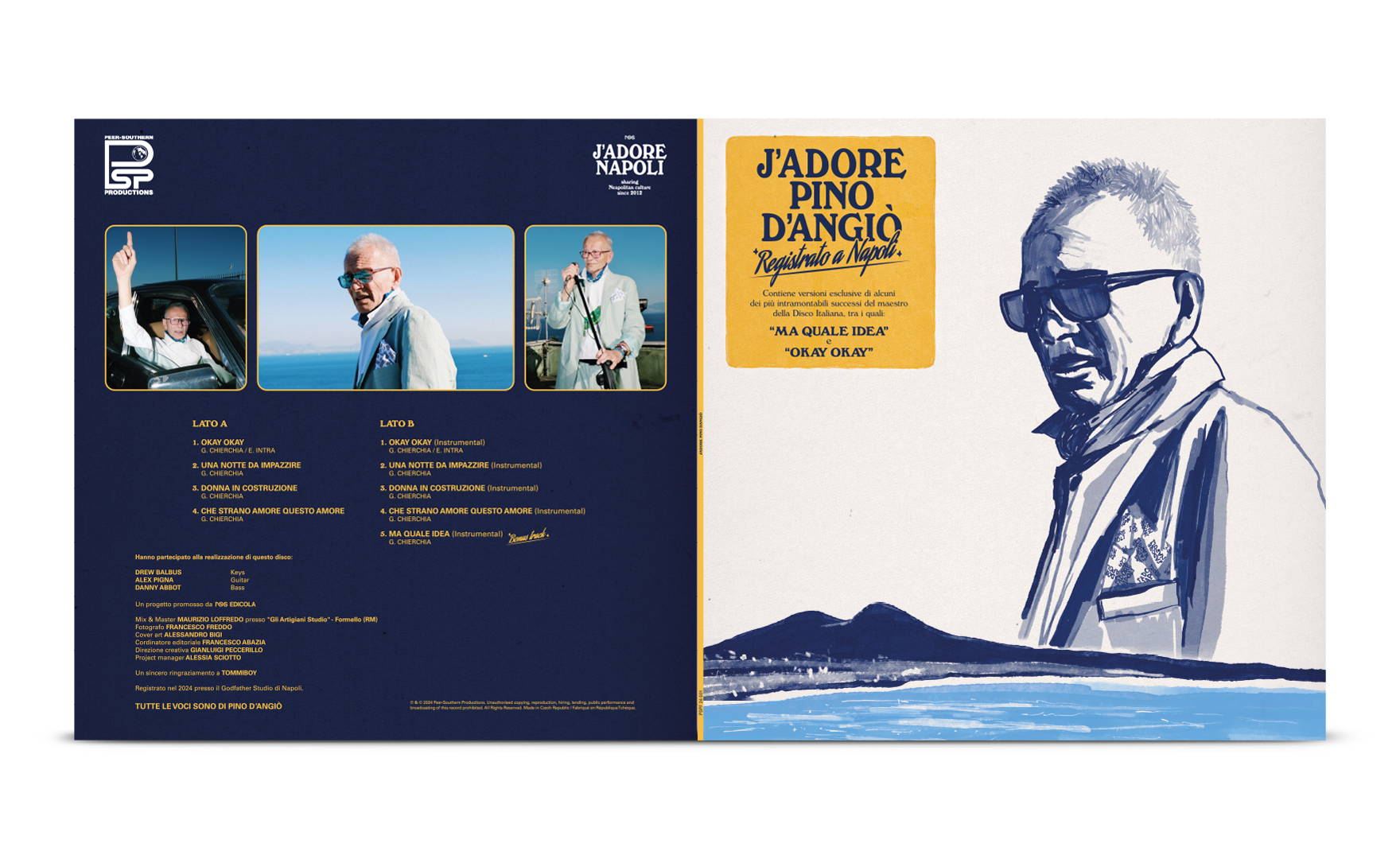 Il progetto “J’Adore Pino D’Angiò” celebra l’eccezionale carriera musicale dell’artista, intrecciando la sua identità partenopea e l’iconico stile disco. Registrato a Napoli, su una terrazza di Posillipo con vista sul Vesuvio, il vinile ripercorre le origini di D’Angiò, nato a Pompei, attraverso quattro dei suoi brani più celebri: “Okay Okay,” “Una Notte da Impazzire,” “Donna in Costruzione” e “Che Strano Amore Questo Amore.” A completare l’opera, una bonus track esclusiva: la versione strumentale inedita di “Ma Quale Idea,” il pezzo che ha segnato il ritorno dell’artista al grande pubblico con la cover eseguita dai Bnkr44 durante la 74esima edizione del Festival di Sanremo.