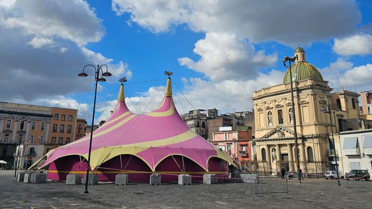 In piazza Mercato svetta una struttura rétro che gioca sui contrasti tra il rosa e il giallo per separare il mondo fantastico da quello reale, installata in occasione del festival di Carnevale promosso dal Comune di Napoli. Si susseguiranno tre giornate di festa tra musica, performance e ritualità.