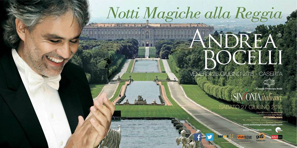 Lo splendido Parco della Reggia di Caserta farà da scenario ad una notte davvero speciale. Infatti, il 26 giugno 2015, alle ore 21.30, il grande tenore italiano Andrea Bocelli sarà protagonista della prima serata di “Notti Magiche alla Reggia”.