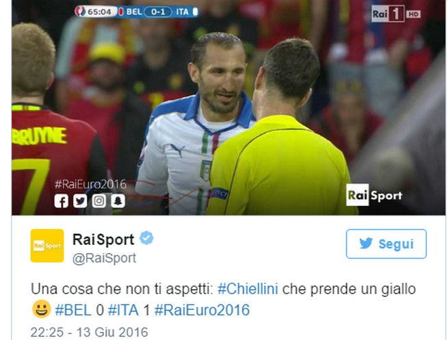 Ieri la nazionale italiana ha battuto la compagine belga per 2-0 nella partita d’esordio di EURO 2016 grazie alle reti di Emanuele Giaccherini e Graziano Pellè, ma c’è un episodio che sta facendo discutere in queste ore ed è legato all’ammonizione avvenuta al 65′ del difensore juventino Giorgio Chiellini.