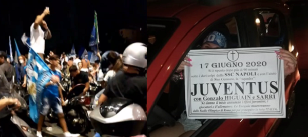 Tanti sono stati gli sfottò e le grida di giubilo. C’è chi ha affisso la maglia di Cristiano Ronaldo sopra un cassonetto dell’immondizia a via Toledo, chi invece ha deriso la Juventus con il classico manifesto funerario. Per non parlare dei cori anti Juventini e sarriani.