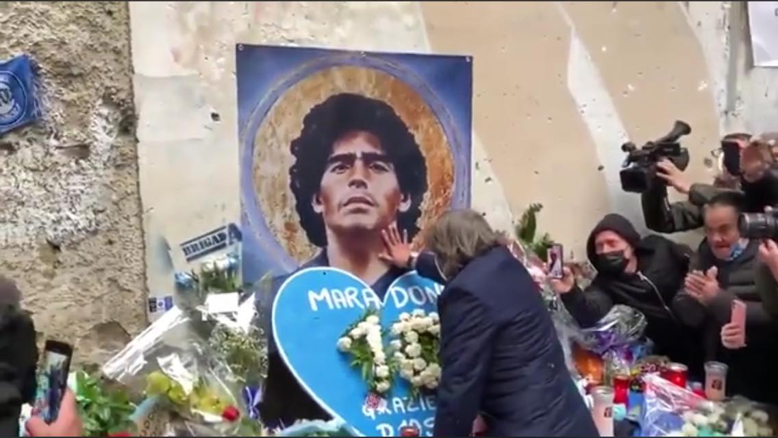 A rappresentanza di tutta l’A.S Roma, Bruno Conti ha portato con sé una corona di fiori con sopra il numero 10, simbolo di Maradona. L’uomo si è poi inginocchiato in religioso silenzio e, tra gli applausi della gente, ha pregato e salutato per l’ultima volta il viso del giocatore.