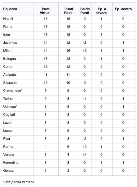 In questa speciale classifica, Napoli, Roma e Inter condividerebbero il primato con 15 punti, seguite da Juventus e Milan a quota 14. Il Torino avrebbe un punto in meno rispetto al reale, mentre al Pisa mancherebbero due punti che lo tirerebbero fuori dalla zona retrocessione. A beneficiarne sarebbero Parma e Verona, con un saldo rispettivo di +2 e +1 punti.