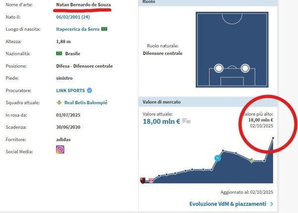 Secondo il sito Transfermarkt.it, il valore di mercato di Natan, ex difensore di Napoli e Bragantino, sta aumentando: la sua quotazione è arrivata a 18 milioni, che è il doppio rispetto alla quota per cui è stato venduto dal Napoli questa estate, cioè circa 9 milioni di euro.