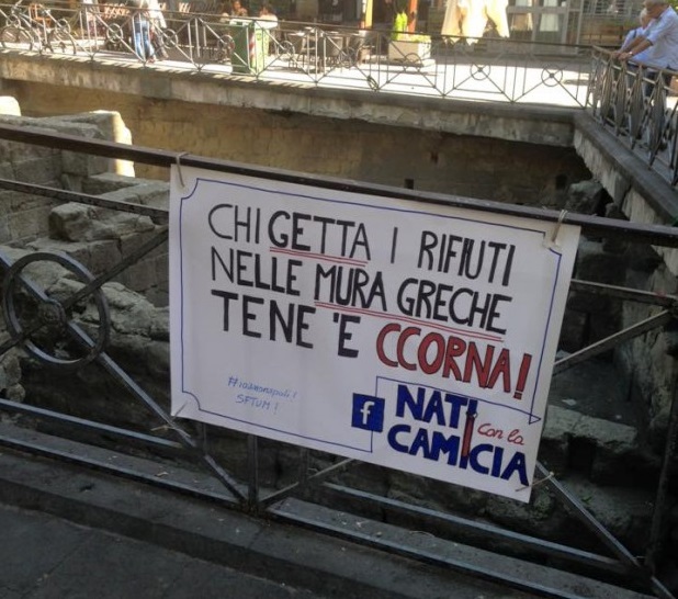 Passeggiando per Piazza Bellini sulle ringhiere che circondano le mura greche è stato affisso un cartello con scritto: “Chi getta i rifiuti nelle Mura Greche tene e ccorna!”. Una simpatica idea dei ragazzi della pagina Facebook “Nati con la camicia” che in modo ironico hanno dato vita ad una serie di “avvertimenti” indirizzati a vandali e a persone poco rispettose del nostro immenso patrimonio culturale. L’obiettivo è ricordare loro che è importante salvaguardare, rispettare ed apprezzare i monumenti e i resti archeologici della città.
