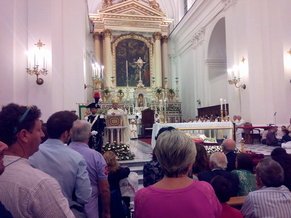 Una piazza in festa, quella antistante la Basilica, tra la commozione dei fedeli e gli applausi all’ingresso del Cardinale Crescenzio Sepe nella chiesa.