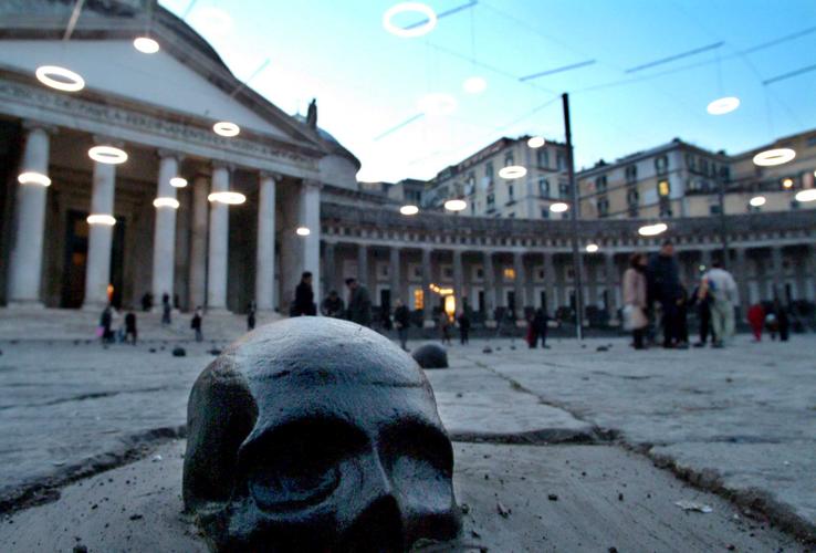 Era il 2002 quando nel periodo di Natale Piazza del Plebiscito fu invasa da più di 300 teschi in ghisa ed oltre 70 aureole luminose. Sono passati ben 13 anni dalla particolare mostra dell’artista tedesca Rebecca Horn, intitolata “Spiriti di madreperla”, con la quale si rievocavano le anime del purgatorio, le “capuzzelle” di Napoli.