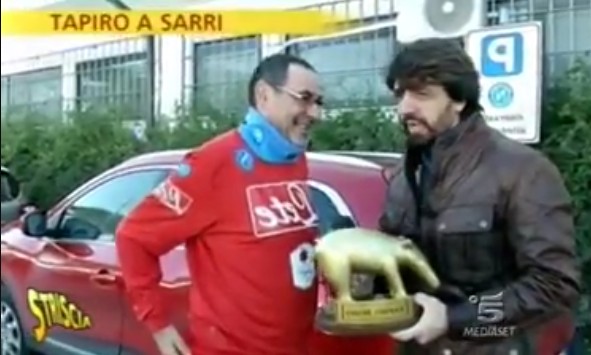 Il Giudice Sportivo Tosel cala il sipario sulla vicenda Sarri-Mancini, con 2 giornate di squalifica rifilate al tecnico del Napoli. Non poteva mancare la consegna del tapiro da parte dell’inviato di Striscia la Notizia, Staffelli. Raggiunto a Castelvolturno, l’allenatore del Napoli si scusa per l’accaduto e spiega come sono andati i fatti: