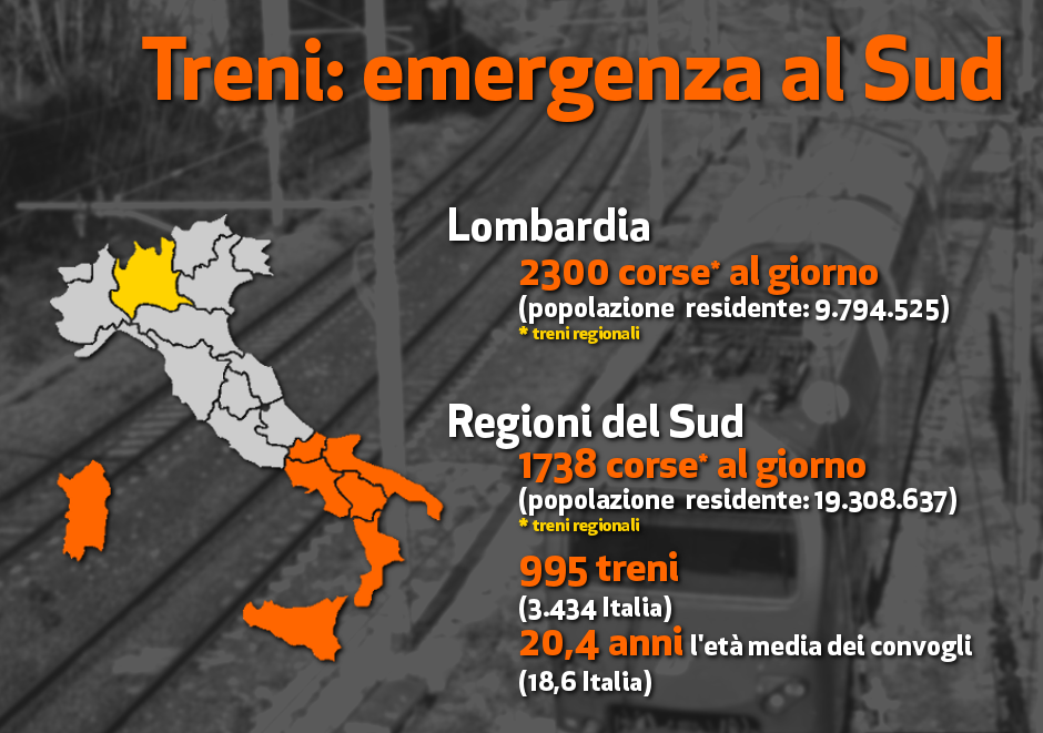 Al Sud circolano meno treni. L’attuale livello di servizio nelle Regioni del Sud è imparagonabile per quantità a quello del Nord. Ogni giorno in tutto il Sud circolano meno treni regionali che nella sola Lombardia . In particolare tra Campania, Molise, Puglia, Basilicata, Calabria, Sicilia e Sardegna i treni effettuano 1.738 corse, ossia decisamente meno dei 2.300 della sola Lombardia. E se si pensa che questo sia giustificato dalla quantità di persone presenti allora è necessario ricordare che la popolazione della stessa Lombardia equivale a quella di Sicilia e Campania messe assieme, e che le Regioni del Sud hanno oltre il doppio degli abitanti (19,5 milioni contro 9,7). Non si tratta di un problema di popolazione, ma ancora una volta di risorse e di scelte politiche, soprattutto se si vanno a guardare le enormi differenze ad esempio tra Lombardia e Sicilia. Quest’ultima, quarta Regione in Italia per popolazione con 5 milioni di abitanti, vede circolare meno di 1/5 dei treni regionali della Lombardia, Regione che però ha solo il doppio degli abitanti. Se poi si guarda ai collegamenti con Frecce, Italo, Intercity il confronto diventa impietoso sia in Sicilia che nel resto del Sud.