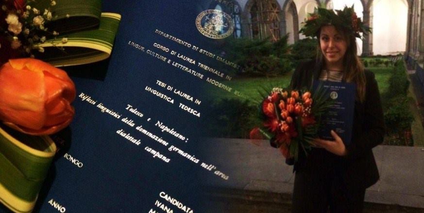 Una studentessa modello che ha discusso una tesi tanto interessante quanto complicata sulla lingua tedesca e quella napoletana. In particolare la giovane di Fuorigrotta, ha documentato quanto l’arrivo dei Longobardi in Italia e in particolar modo in Campania, abbia influenzato la nostra lingua (quella napoletana), molto di più di quanto ci si possa aspettare sia avvenuto nel Nord Italia, dove della presenza germanica è rimasto, invece, ben poco riguardo ovviamente all’aspetto linguistico. Il motivo – ce lo spiega Ivana – è il frutto di una maggiore integrazione dei Longobardi con le popolazioni già esistenti: non fu una invasione, come al Nord, ma una fusione tra popoli.