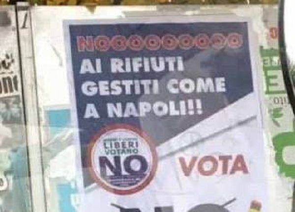 A denunciarlo il consigliere regionale dei Verdi, Francesco Emilio Borrelli, e Gianni Simioli de La radiazza, postando su fb la foto di un manifesto in cui si invita a votare No per non avere una gestione dei rifiuti come quella di Napoli.