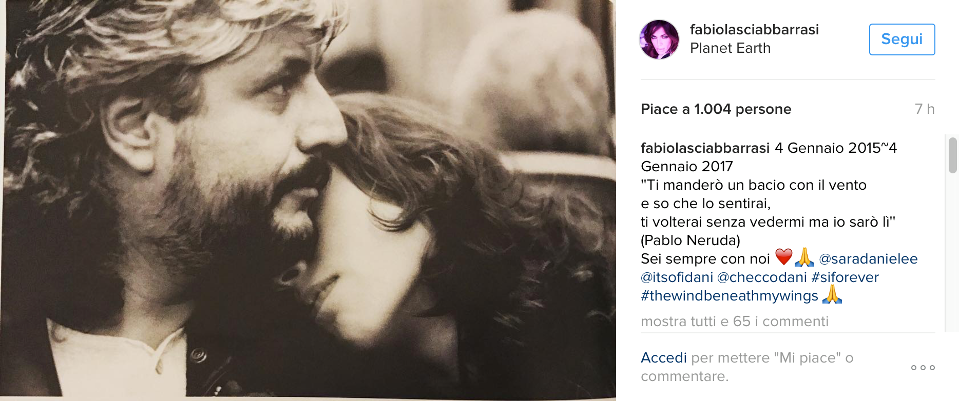 La sua seconda ex-moglie, Fabiola Sciabbarrasi, ha condiviso su Instagram una foto che la ritrae assieme a Pino. Poi, il commosso ricordo attraverso le parole di Pablo Neruda: “Ti manderò un bacio con il vento e so che lo sentirai, ti volterai senza vedermi ma io sarò lì“. Conclude: “Sarai sempre con noi“.