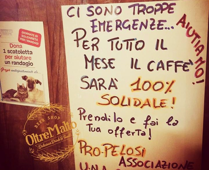 E’ l’iniziativa di “OltreMalto Beer Shop”, una locale dove poter bere birra, te e tisane che ha offerto l’iniziativa per aiutare le associazioni di volontariato animalista del casertano. Già avevano deciso in precedenza di usare “Il Caffè di Lilly”, una miscela dove una percentuale del fatturato annuo dell’azienda va agli animali meno fortunati. Ora per tutto il mese il caffè di questo locale sarà 100% solidale.