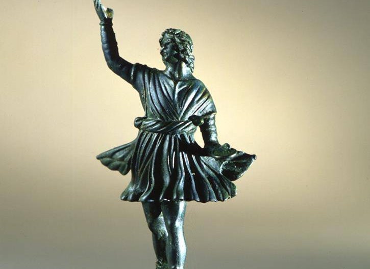 La terza è una statuetta bronzea raffigurante un Lare danzante con vaso potorio (rython) nella mano destra e una scodella (patera) in quella sinistra.