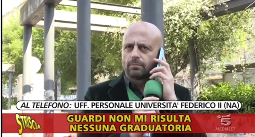 Nuovo scoop di Striscia la Notizia a Napoli: l’inviato del tg satirico Luca Abate smaschera un mercato di posti di lavoro all’Università Federico II di Napoli. “Approfittando della disoccupazione che affligge tanti giovani – dice Abete – un venditore si dice ben agganciato e in grado di garantire un posto fisso a ogni disoccupato. Noi lo abbiamo beccato e lui ha reagito così”.