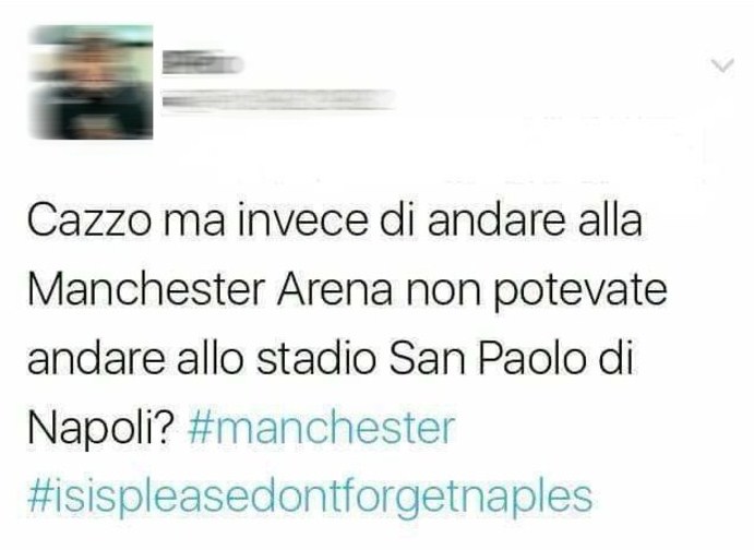 Un tweet al veleno di un utente sta scatenando reazioni sui social di rabbia, e non solo, cavalcando l’onda del drammatico attentato a Manchester. Questo il messaggio dell’utente XXX: “Cazzo, ma invece di andare alla Manchester Arena, non potevate andare allo stadio San Paolo di Napoli?”.