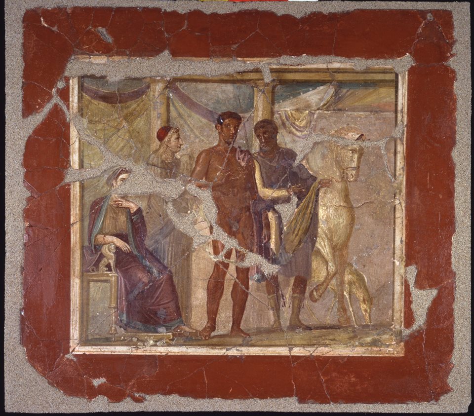 In questo secondo affresco da Pompei c’è una scena particolare, ispirata al teatro: è la confessione dell’amore di Fedra per il giovane Ippolito, in procinto di partire per la caccia. Risale alla prima metà I secolo d.C.